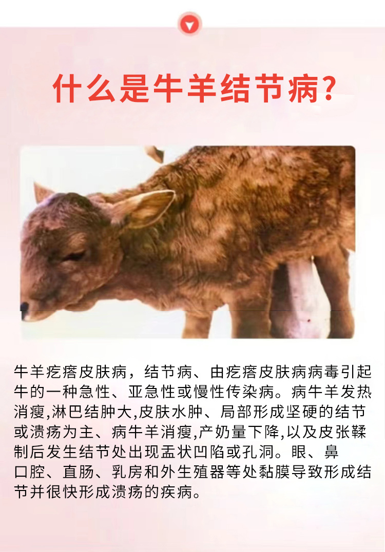 牛羊疙瘩皮膚病,結節(jié)病、由疙瘩皮膚病病毒引起牛的一種急性、亞急性或慢性傳染病。病牛羊發(fā)熱消瘦,淋巴結腫大,皮膚水腫、局部形成堅硬的結節(jié)或潰瘍?yōu)橹鳌⒉∨Q蛳?產(chǎn)奶量下降,以及皮張鞣制后發(fā)生結節(jié)處出現(xiàn)凹陷或孔洞" />