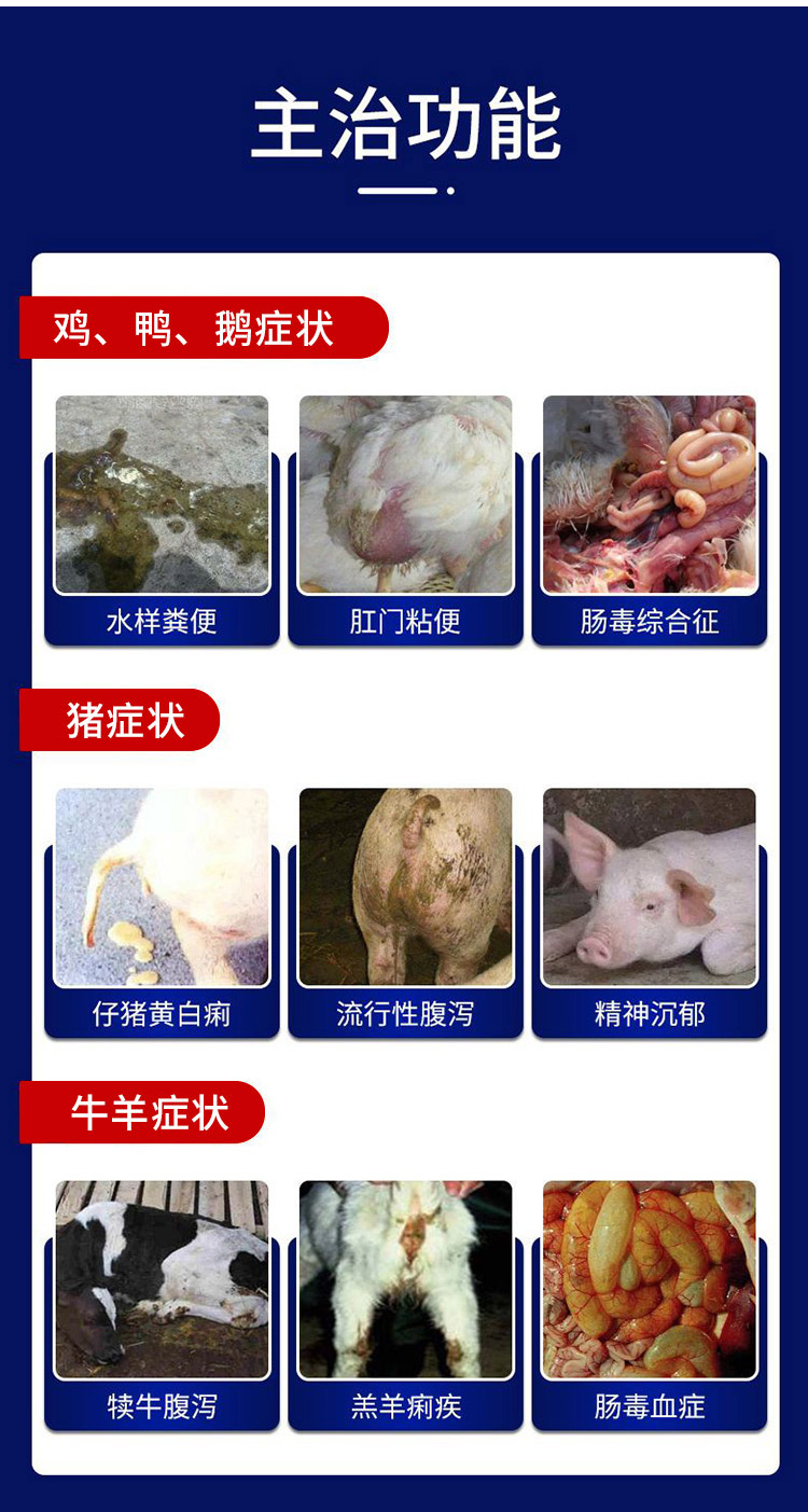 1.防治仔豬黃痢、白痢、水腫病、傳染性胃腸炎、流行性腹瀉、斷奶仔豬應激性腹瀉等引起的不吃不動、被毛粗亂、腹脹、痢疾、拉黃、白、綠色水樣便等以及犢牛、羔羊不明原因腹瀉。